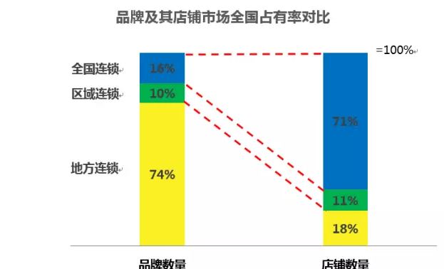 另一方面,覆盖全国市场或多个区域的全国性连锁品牌占16%,而这16%的全国连锁品牌开设的店铺数量占总店铺数量80321中的71%,呈现出中国品牌市场中的“二八规律”。