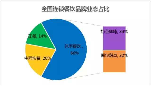 在选取的全国连锁餐饮品牌样本中,休闲餐饮占比达66%,中西快餐品牌占比为20%,正餐占比14%。