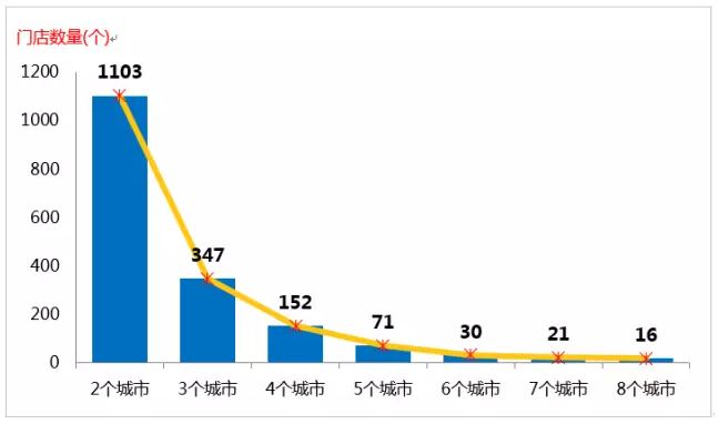 这反映出:跨城市拓展,品牌对前3个城市的选择至关重要;二从2个城市发展到5个城市之间困难最大。