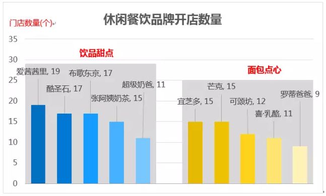 面包点心类占比高于饮品甜点(面包点心占比60%,饮品甜点占比40%),但两者的门店数量相差不大。面包点心类品牌平均开店数量为13家,饮品甜点类品牌平均开店数量16家。