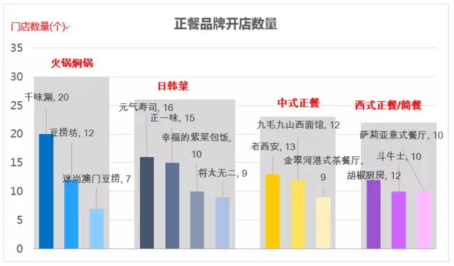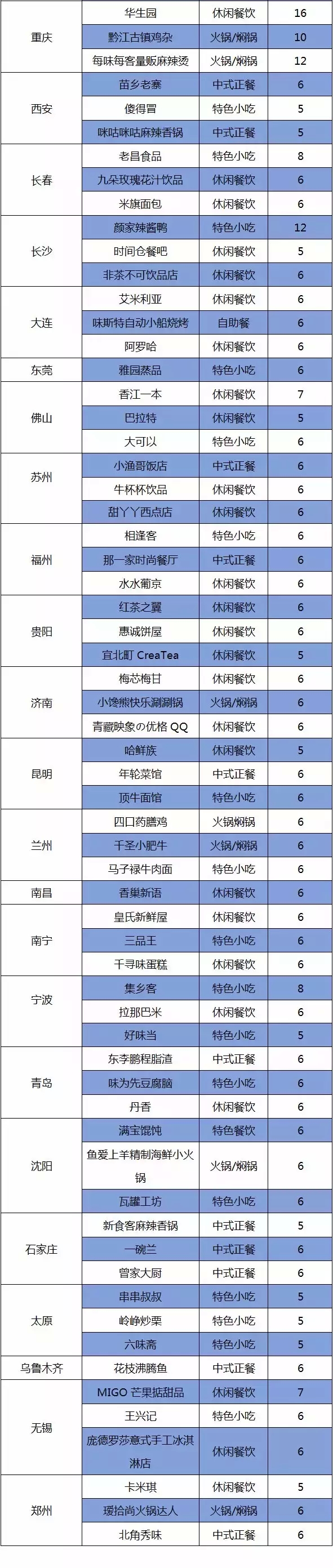 正餐类品牌则因食材与供应链的问题,缺乏标准化的复制模式,在全国连锁速度发展较为缓慢。