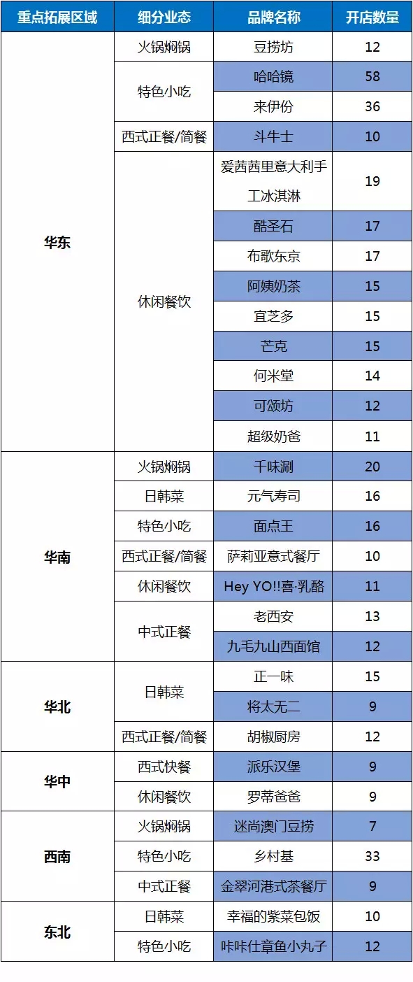 虽然目前主要在一个区域开店,但下一步的计划是向全国重点拓展,这一类的品牌数量较多,如华东的火锅焖锅【豆捞坊】、特色小吃【来伊份】、西式正餐【斗牛士】;华南的日韩菜【元气寿司】、休闲餐饮【Hey YO!!喜·乳酪】、中式正餐【九毛九】;华北的日韩菜【将太无二】、西式正餐【胡椒厨房】等等。