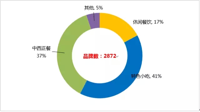 所取样本中,高潜力品牌数量总计2872个,其中特色小吃和正餐分别为41%和37%,休闲餐饮占比17%。