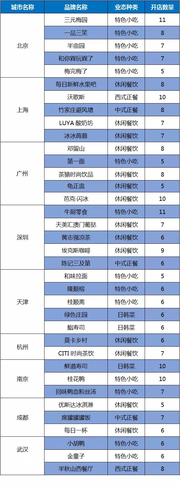 备注:上表所列品牌为重点主要在1个城市开店,且开店规模在5家购物中心及以上的品牌;