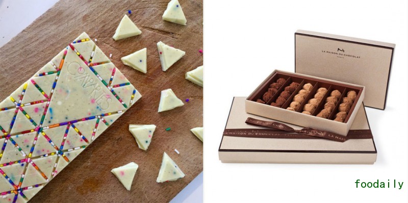 洛杉矶巧克力公司推出的白巧克力佳品 Let Them Eat Cake 巧克力包含三款香草豆巧克力、白色生日蛋糕以及彩虹糖。整套有机产品看起来也是趣味盎然,吃起来确实内涵丰富,有如一款浓郁的糕点。(上图左)