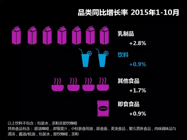 以食品品类为例,乳制品及饮料类产品占据食品品类56%的销售比重,而增长不一。随着消费者健康意识的不断提升,乳制品作为食品第一大细分品类,仍然展现高于食品平均增速,为2.8%,成为带动食品品类增长的驱动品类。而饮料作为食品第二大细分品类,则面临更大的增长压力,截止2015年10月数据,销售额增长仅为0.9%。