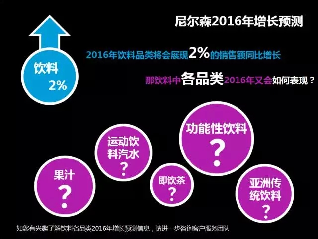 尼尔森研究显示,2016年对于线下线上来说仍然是机遇之年,不乏快速增长的品类,也有快速增长的区域市场出现,如何洞悉先见之明,提早把握和布局,是赢得市场胜利的关键。以饮料品类看,根据《尼尔森2016年增长预测报告》显示, 2016年饮料品类将会展现2%的销售额同比增长,对比2015年1至10月同比0.9%的销售额增幅略有回升。而带动销售额增长仍然来自于功能性饮料,可见消费者对于健康类产品的关注度更高,购买力也更强。