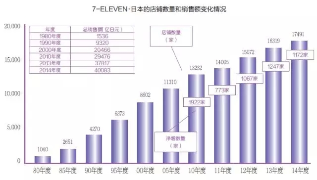 另外,7-11细思极恐的数据也让人惊叹不已:业务范围仅覆盖16个国家和地区,店铺总数却多达55000余家,2014年创造出近9万亿日元的销售业绩,约合人民币4500亿;仅在日本,每年就有超过64亿人次光顾过7-11。