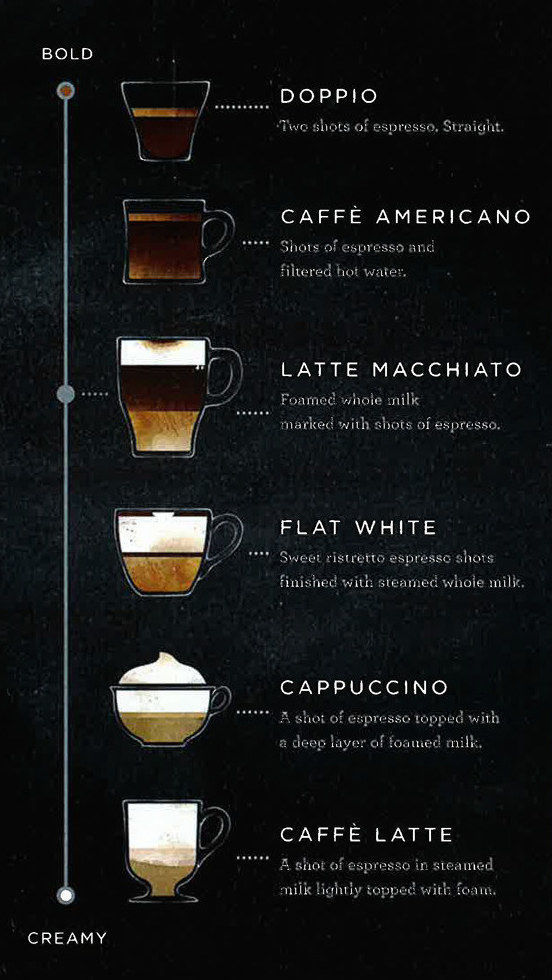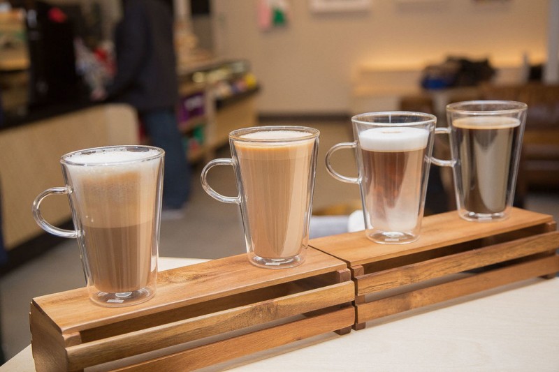 从左至右:从左至右:卡布奇诺、Flat White、拿铁玛奇朵、美式咖啡(来源:Cosmopolitan)