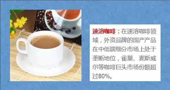 4.即饮咖啡:国内即饮咖啡市场的参与者有雀巢、星巴克、统一、伯朗、康师傅、麒麟等。