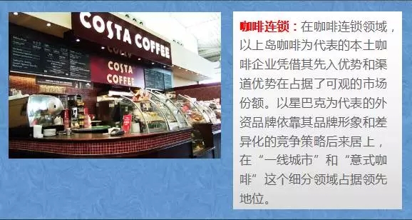 3.咖啡连锁:一些新兴咖啡连锁品牌凭借精准的市场定位和独树一臶的经营模式逐渐打破了星巴克及上岛咖啡对市场的垄断地位。