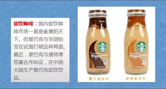 2015年3月,星巴克携手康师傅再战即饮咖啡市场,推出“星冰乐”;