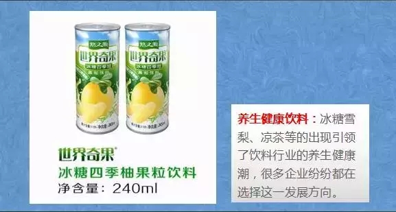 5.养生健康饮料:养生健康饮料势头正盛,业内外参与者不断,如业内企业对蜂蜜柚子茶、枇杷润肺茶的开发;业外企业多数是制药企业,他们拥有研发、原材料等多个优势。