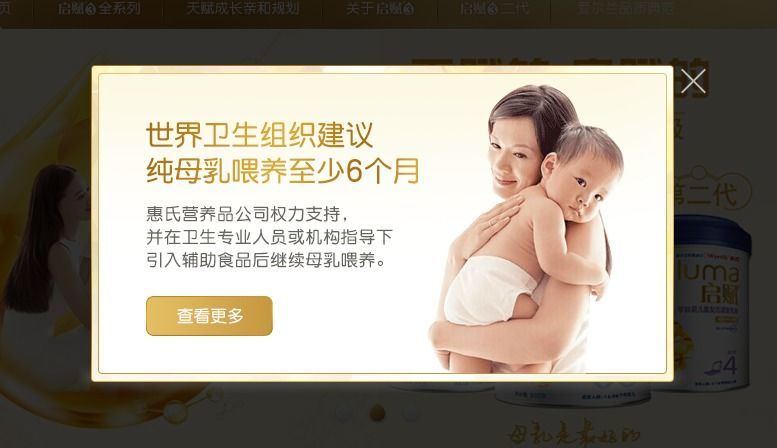 外资品牌的优势在于品牌价值、口碑、较强的定价能力,并且善于在高端奶粉市场进行营销。当你打开启赋奶粉的官网,首先弹出来的窗口竟然是在向你宣传“母乳喂养”,如果你看完整条启赋 3 “全明星”版本的广告,会发现汪涵、昆凌、江南春等人都在谈的一件事,叫做让孩子“由自己的天赋作主”。撇开产品里添加的 OPO 分子结构,要卖出高价,你还得兜售一种精英父母的育儿理念。