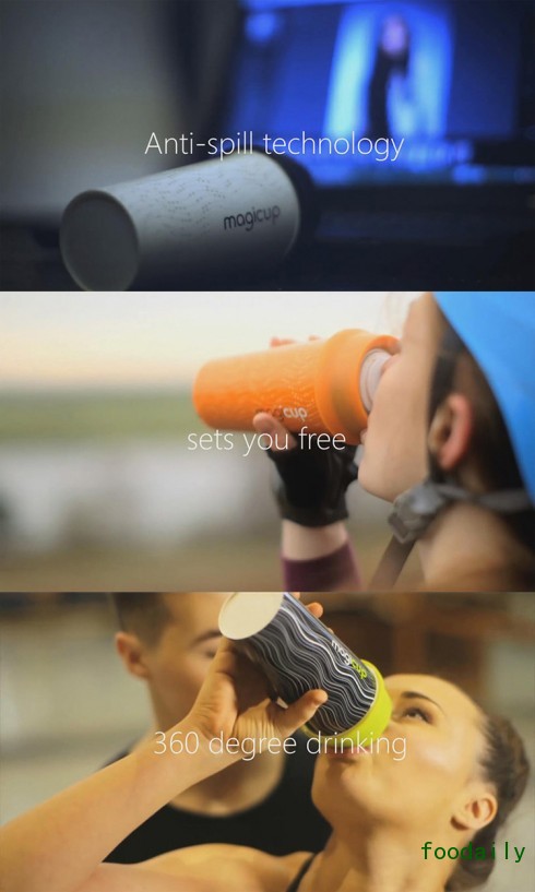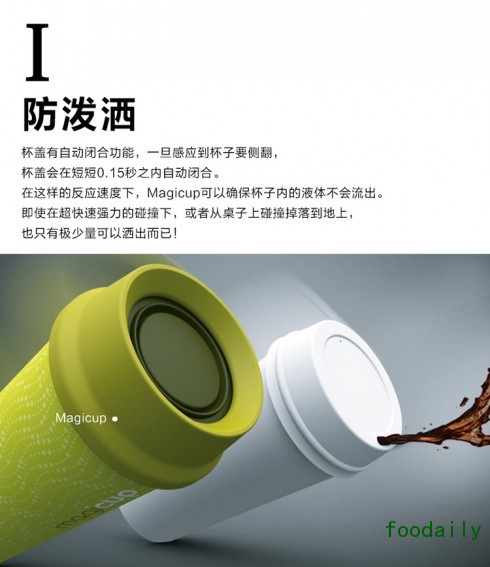 Magicup杯盖有自动闭合功能,一旦感觉到杯子要侧翻,杯盖会在短短0.15秒内自动闭合,并确保杯子内的液体不会流出,即使超快速强力碰撞、或者从桌上掉落,也只有极少量可以洒出。