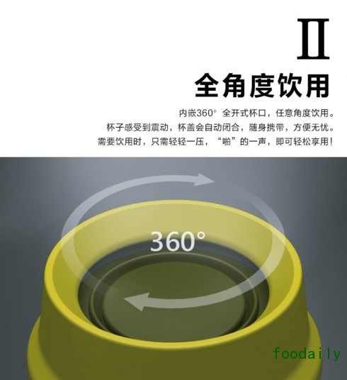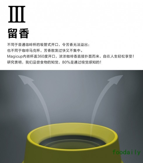 普通咖啡杯的密闭盖装,无法感知咖啡的香味,令享受的乐趣骤减。Magicup特有内嵌360°全开式杯口,浓浓咖啡香扑面而来,只需轻轻一压,任意角度均可饮用,不用再苦苦寻找那个小口啦。