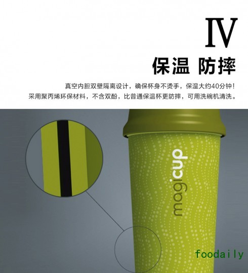 真空内胆双壁隔离设计,确保杯身不烫手,保温大约40分钟。聚丙烯环保材料,不含双酚,可用于洗碗机。