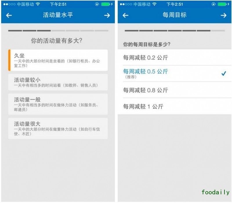 注册时,MyFitnessPal 会要求你填写诸如“日常活动量”、“体重目标”、“身高体重”等信息,然后你可以根据自己的进餐情况来添加食物,安排你的运动,简单来说,这是一个拥有强大数据库的卡路里计算器。