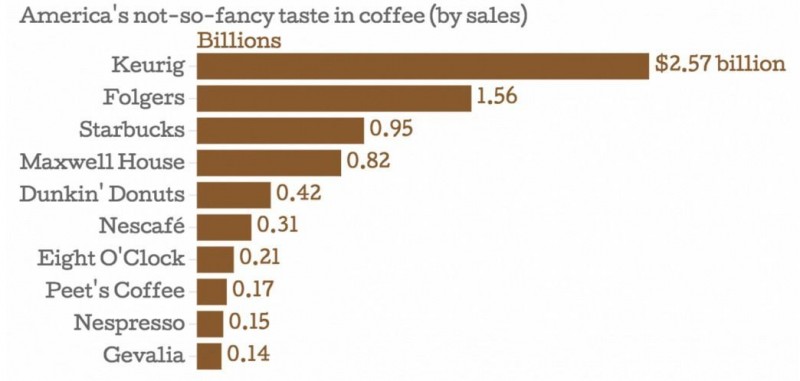 根据华盛顿邮报 2014 年的数据,在美国市场,零售咖啡(包括咖啡胶囊、咖啡豆和研磨咖啡粉)中销量最高的品牌由高到低依次为绿山(Keurig)、Folgers、星巴克、麦斯威尔、唐恩都乐和雀巢。