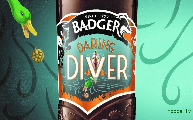 独立的啤酒厂Hall & Woodhouse与设计公司BrandOpus合作创造了Badger Daring Diver,这是Badger品牌麦芽酒系列的新品。新设计的包装标签以富贵金桔色打底,一只野鸭潜入水中,结合了麦芽酒像饼干一样的显著标识。BrandOpus说选择野鸭作为新产品的吉祥物,是因为它的天然形象可以很好地融入Badger啤酒作品集的田园风格,也展现了该品牌的原生态诉求。