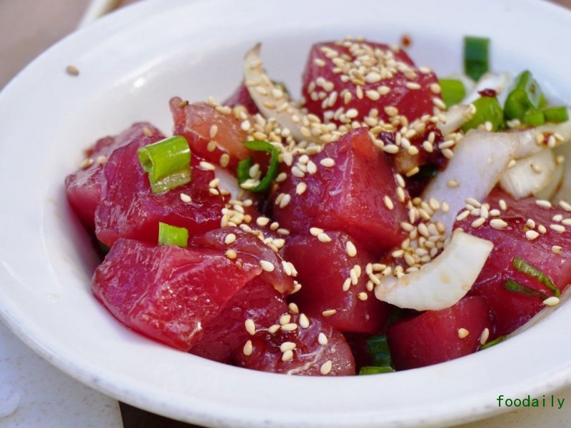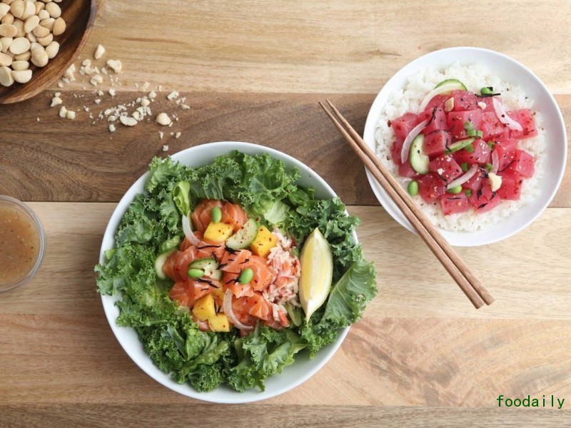 poké 看起来像是鱼生沙拉,切成块的金枪鱼、三文鱼之类的生海鲜,搭配洋葱、牛油果等,拌酱汁,可以直接单做成沙拉或者盖在米饭上。看上去跟日本菜里的鱼生饭倒是很像。