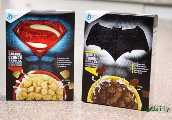 通用磨坊与华纳兄弟公司合作推出“蝙蝠侠”等超级英雄主题形象的谷物产品。每盒包括蝙蝠侠形状巧克力草莓片或超级英雄盾牌形状的焦糖脆片。