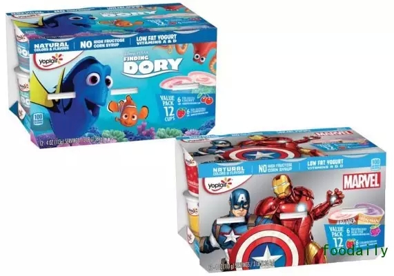通用磨坊的优诺品牌推出了《美国队长》、《钢铁侠》以及《海底总动员》中的小丑鱼Dory等卡通形象的酸奶。该系列酸奶有多种风味:奇迹覆盆子, 草莓,樱桃等。