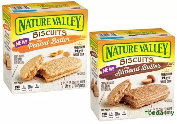 通用磨坊的Nature Valley品牌推出了坚果黄油夹心饼干。这款饼干特色为中间夹有花生酱和杏仁酱,能量来源于其含有的14g全谷物。