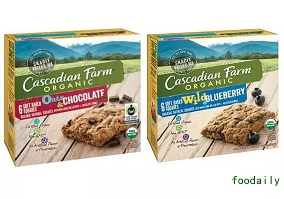Cascadian Farm 焙烤软燕麦棒:包含巧克力等有机组分和全谷物,口味上有燕麦&巧克力味与野生蓝莓味。