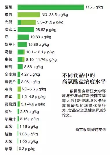 美国FDA在2004年到2006年进行的一项大规模调查显示,饮用水、肉制品、谷物、饮料、蔬菜水果中均存在不同浓度的高氯酸盐,水产品还因富集作用成为高氯酸盐摄入高风险产品。美国环境工作小组2009年也公布,15个品牌婴幼儿奶粉均检出高氯酸盐。