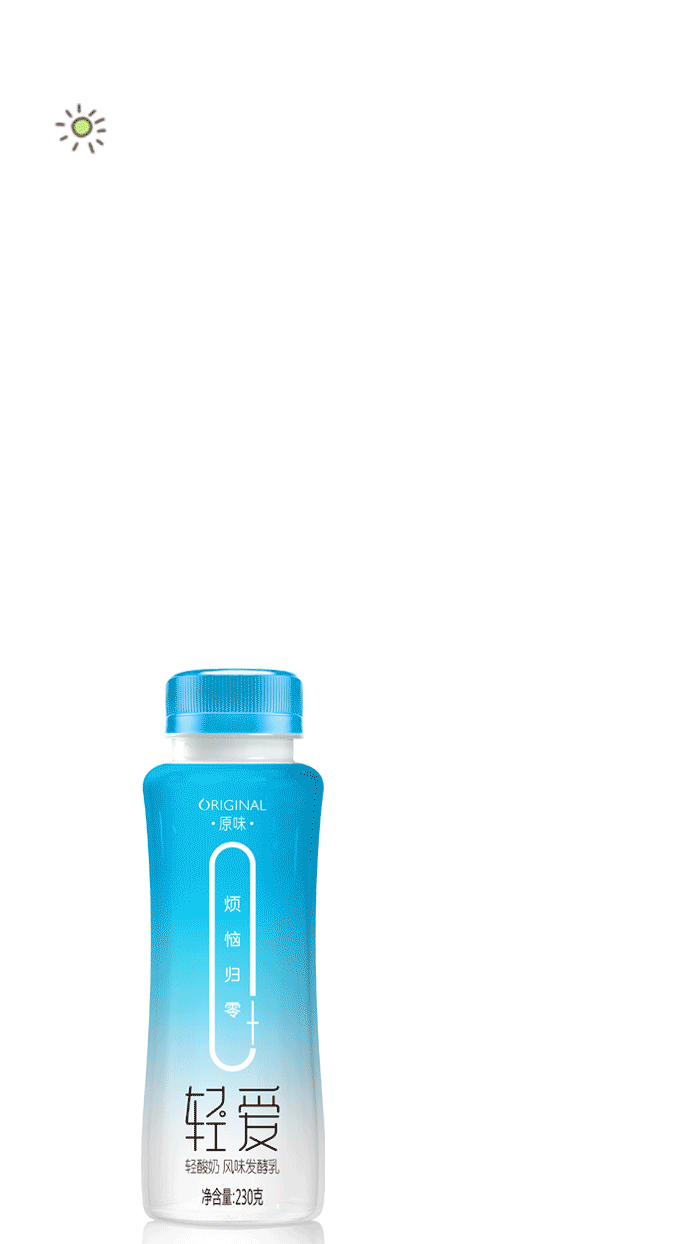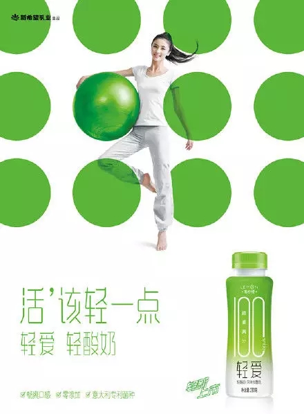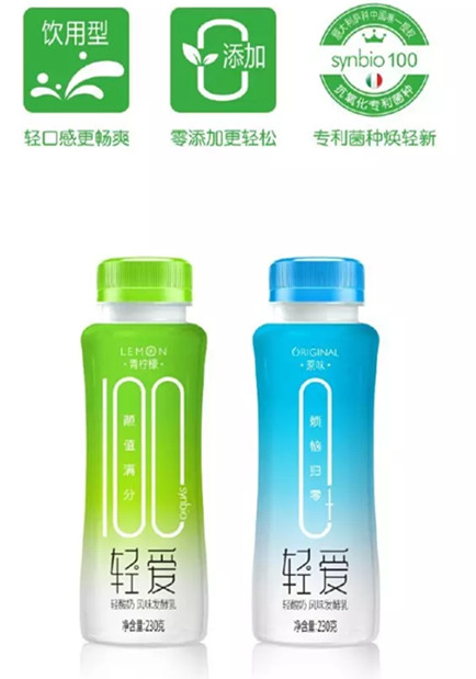 “活,该轻一点“轻松性感的广告口号,匀称修身的造型,使得产品初入市场后处处拉风。轻爱•轻酸奶与众不同的上市:主打零添加,保证口味的同时更不添加防腐剂、着色剂、甜味剂;意大利专利菌种Synbio100,其抗氧化功能可提升颜值、缓衰老,是酸奶的一次有益尝试;轻盈的口感,不同于传统稠厚的酸奶,轻爱·轻酸奶是轻盈的口感。