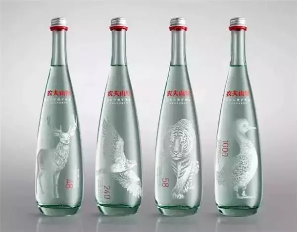 农夫山泉的玻璃瓶天然矿泉水获得了Pentawards包装设计大奖饮料类别铂金奖(饮料类别的最高奖项)。该设计以自然为灵感,一共有八个包装形态,其中全透明的四个包装分别选取了长白山的典型天气和植物:雪花、山楂海棠、蕨类植物和红松果实。泛绿色的四款设计用于含气天然矿泉水,选取了长白山四种典型的动物,包括东北虎、中华秋沙鸭、马鹿和鹗。农夫山泉瓶身的设计充满传统中国艺术色彩,给人以与众不同的感觉。