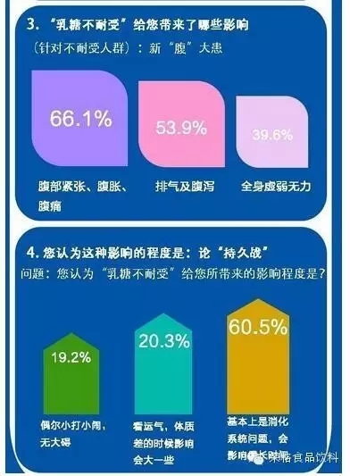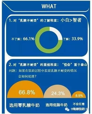 据结果显示,目前多数国人对乳糖不耐受尚未拥有一个明确的认知,多数人在发觉自身患有乳糖不耐受之后会选择零乳糖牛奶或低脂牛奶,但仍有近一成的人群不会在意,继续饮奶。