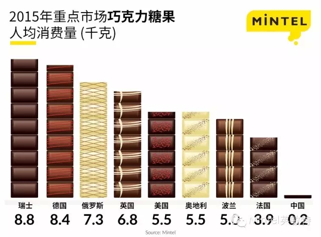 尽管欧洲的消费者表达了吃巧克力是作为一种情感药物的信念,但这一点也不奇怪,或许欧洲真的拥有世界上最多的巧克力消费者。瑞士荣登排行榜,每个瑞士消费者估计在2015年吃了8.8公斤的巧克力,其次是德国(人均8.4公斤),俄罗斯(人均7.3公斤),英国(人均6.8公斤)、奥地利(人均5.5公斤)和美国(人均5.5公斤)。相比之下,中国的消费者估计2015年的人均只是0.2公斤。