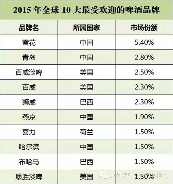 毫无疑问,啤酒是世界上最古老的酒精饮料之一。现在,啤酒也是人们日常生活中最常见的一类酒精饮料,因而全球各地诞生了许多啤酒品牌。据彭博社(Bloomberg)欧洲商情市场调研公司(Euromonitor)数据显示,2015 年全球最受欢迎的啤酒品牌为雪花啤酒,此外中国还有3 款啤酒(分别是青岛、燕京和哈尔滨)位列榜单前 10,而在国际上曾被誉为“啤酒之王”的百威(Budweiser)则位列第 4。