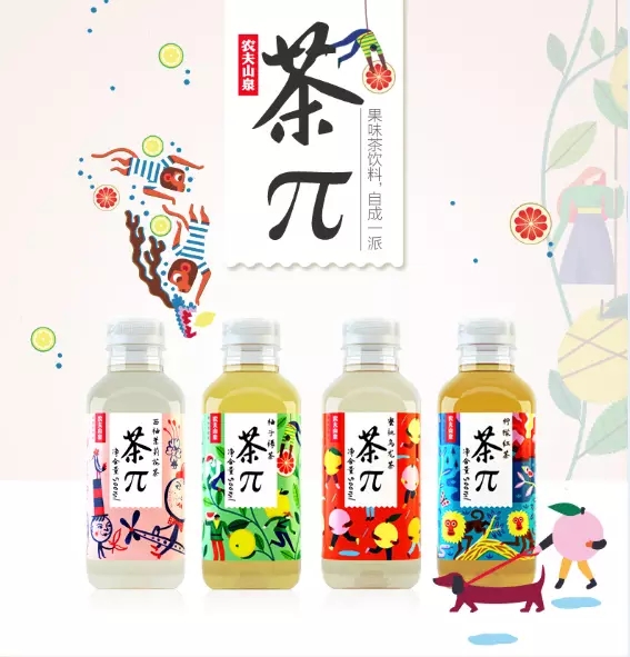 2016年春暖花开之际,农夫山泉推出了四种口味的新品果味茶饮料——茶π系列。彰显年轻生活态度,自成一派。有型有款,不跟谁雷同,我自成一派!四种口味,茶和果汁自成一π,定义年轻味觉!萌萌哒蜜桃乌龙茶、清新派柚子绿茶、颜值粉西柚茉莉花茶、俏皮党柠檬红茶四款口味新品来袭,特色漫画涂鸦式的包装,俏皮而清新。