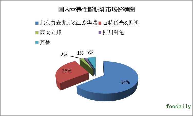 脂肪乳是大输液的高端产品。目前,我国已成为全球第一静脉输液大国,但是在脂肪乳产品生产上却发展相对缓慢,众多大输液企业在葡萄糖、氯化钠等基础输液领域残酷竞争。营养性脂肪乳在我国的市场规模将近50亿人民币,该领域市场集中度较高。国内生产脂肪乳的厂家有华瑞制药有限公司、广州百特侨光医疗用品有限公司、四川科伦制药、三菱制药(广州)有限公司、德国巴朗沈阳医药公司等一系列公司,生产结构脂肪乳的厂家仅有华瑞制药一家企业,并且产品关键技术掌握在外资企业手中。销售前五名的企业分别是北京费森尤斯、江苏华瑞、百特侨光、贝朗和西安立邦,合计占94%的市场份额。其中费森尤斯和华瑞的市场份额达到了64%以上。而纯粹本土生产企业西安立邦所占市场份额为2.35%。