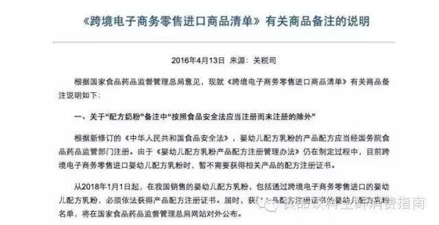 一份对跨境电商新税政策“正面清单”的说明牵出了等待已久的配方奶粉注册制时间表。4月13日晚,财政部关税司发布《<跨境电子商务零售进口商品清单>有关商品备注的说明》(下称《说明》。《说明》指出,目前跨境电子商务零售进口婴幼儿配方乳粉时,暂不需要获得相关产品的配方注册证书。称从2018年1月1日起,在中国销售的婴幼儿配方乳粉,包括通过跨境电子商务零售进口的婴幼儿配方乳粉,必须依法获得产品配方注册证书。