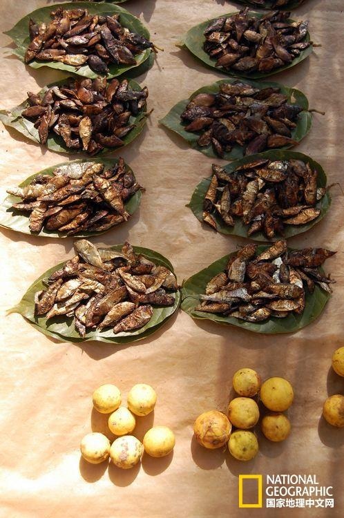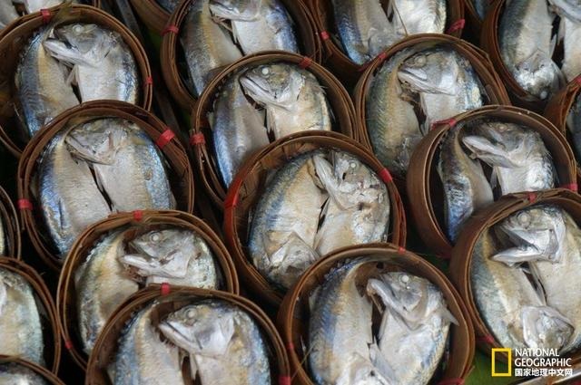 泰国恰蒂斯加尔邦,佐以酸橙汁的咸鱼干被搁在叶片上贩卖。