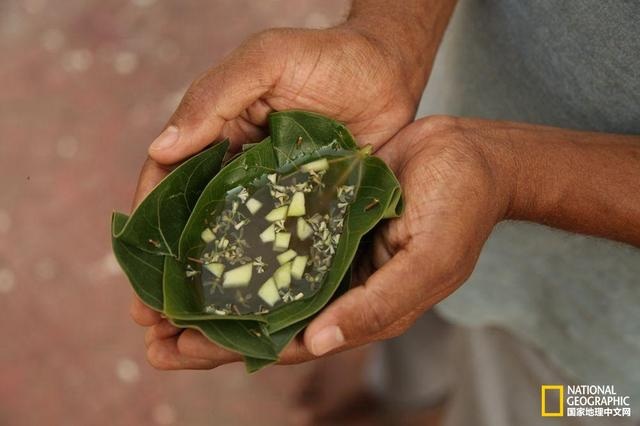 由于显而易见的原因,用天然包装来盛放饮料是件棘手的事情。这种名为“Ugadi pachadi”的饮料是添加了甘蔗、生芒果、罗望子和印度楝花的水,在你享用它之前可得小心捧好了。