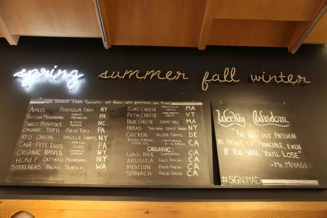 Sweetgreen正对着入口显眼位置的一块小黑板上,有这样的粉笔手写字:红洋葱,来自纽约Dagele农场;有机九层塔,来自纽约Goodness农庄;蜂蜜,来自纽约Catskill食品供应公司;有机小菠菜,来自加州新鲜田野农庄;蓝奶酪,来自麻省大山蓝牧场;鸡肉,来自达拉威尔州艾伦农场;哥伦比亚虹鳟鱼,来自华盛顿州太平洋海鲜公司……一共罗列了16种原料的出处。顾客可以选择名厨专门设计的菜式,也可以自己从三十多种选材中自由混搭。