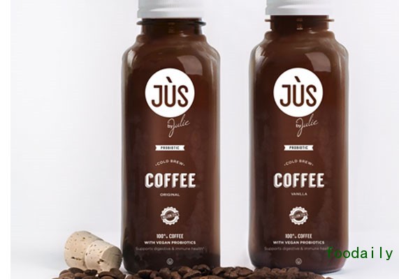 JÚS by Julie推出了添加益生菌的冷泡咖啡。这款16盎司的瓶装饮料中加入了10亿的GanedenBC30素食益生菌,有原味和香草两种口味。
