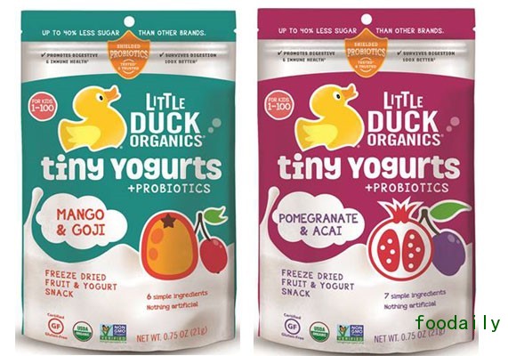 Little Duck Organics推出的Tiny Yogurts冻干水果和酸奶零食,采用了一些简单配料以及GanedenBC30。口味有石榴巴西莓、芒果枸杞以及树莓和椰子。