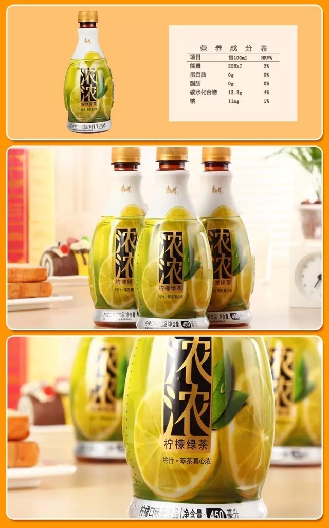 该款产品分为“浓浓柠檬绿茶”和“浓浓柠檬红茶”两种口味,以“柠汁·萃茶真心浓”为产品诉求,突出产品茶味口感浓郁的核心卖点,同时在之前茶饮料产品的基础之上,又增加了新的元素柠檬果汁,在产品外包装上也明显标注出“柠檬口味茶饮品”,更加倾向于果味轻茶饮品的路线。