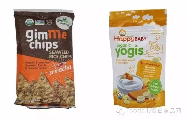 ▲ 美国Gimme拉差酱风味海苔大米脆片和为婴幼儿开发的Happy Baby芒果风味酸奶溶豆并列获得“最创新零食”奖
