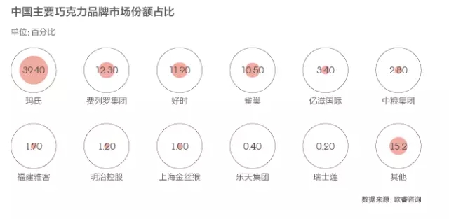 根据欧睿数据显示,在中国巧克力市中,玛氏占比39.4%,费列罗占比12.3%,好时以11.9%比例排名第三,三者并称“巧克力三剑客”。