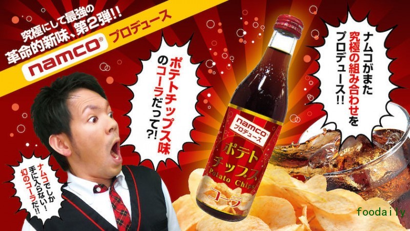 然而在大洋另一端的日本,探索新口味的热情还在继续。从 3 月 15 日起,日本游戏公司南梦宫(Namco)和曾经推出过“鳗鱼味可乐”的木村饮料(Kimura Drink)联手,发布了一款薯片味可乐,想把那种“咬几口薯片、再喝一口冰可乐”的快感汇集到一款产品里。