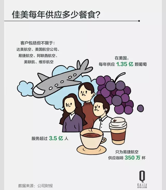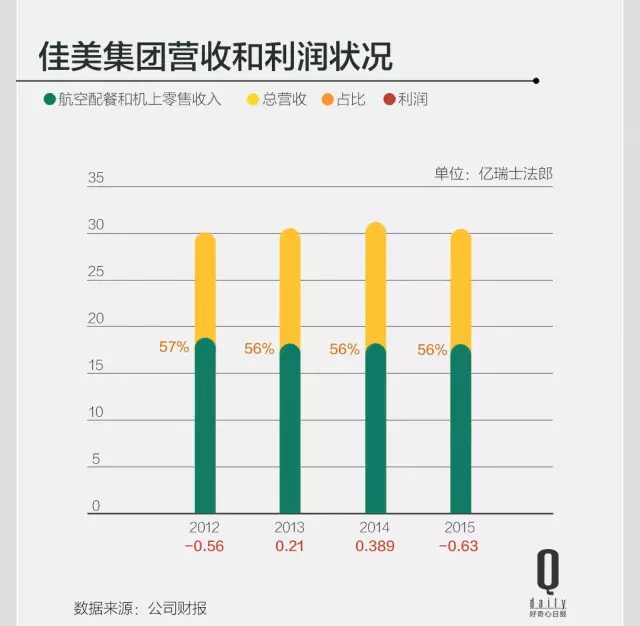 2015年,佳美集团收入达到30亿瑞士法郎(约合203亿元人民币),其中航空配餐部分的收入是16.6亿瑞法(约合113亿元人民币)。