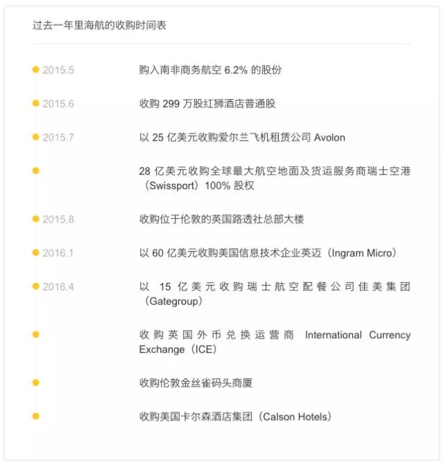 在过去一年里,海航进行了一系列航空及其上下游、酒店、地产等领域的收购,几乎平均每月一笔。