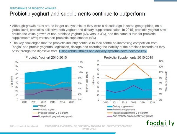 细分市场的挑战包括来自像希腊酸奶等“原始”酸奶、法律的修订、剂量和生物利用率等的竞争。“活力菌株的使用和运输系统已经成为了关键。”